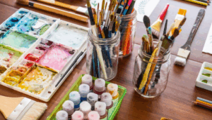さらに霧吹きを用意するとアクリル絵の具の乾燥を防げ、マスキングテープはキャンバスの縁を保護するのに便利です。基本小物を整えることで、制作がぐっと快適になります。